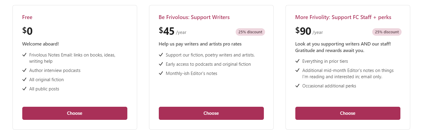Instead the paid tiers provide you personal notes from me, early access reads to the fiction and podcasts we publish. The highest tier avails you to a more frequent email-only note from me on things I'm personally thinking about, including the evolution and growth of Frivolous; as well as "additional perks" (read, "merch") and other things that are frivolously exciting.